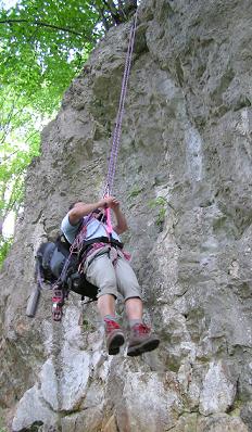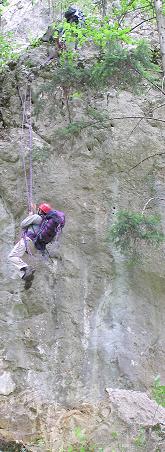 Eventuell ist die Begehung durch Zusammenschluß mit einer anderen Seilschaft möglich - aber sonst nicht, weil uns das Risiko dann eindeutig zu hoch wäre. Möglicherweise sähe das Ergebnis auch anders aus, wenn wir zwischen Übungen verschiedener Rettungsmuster abgeseilt und uns erholt hätten. Aber wir trainierten den Ernstfall, wo Du ja auch nicht abseilen kannst und ein Viertelstündchen Pause einlegst - im Gefrierschrank und frei hängend geht es um jede Minute, das wissen wir jetzt sicher!